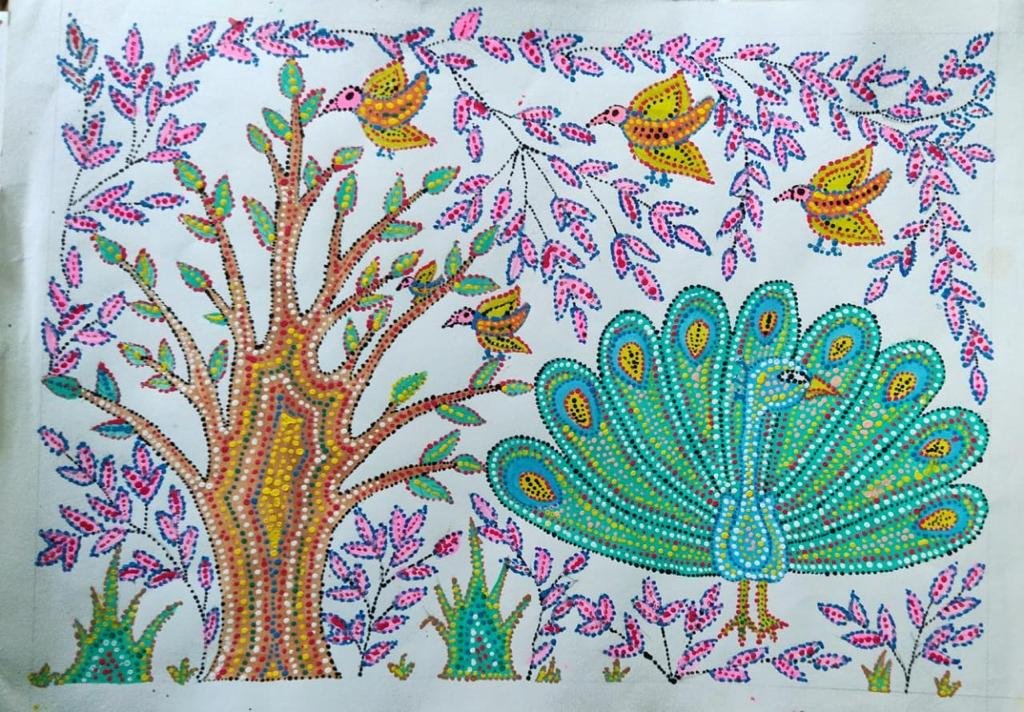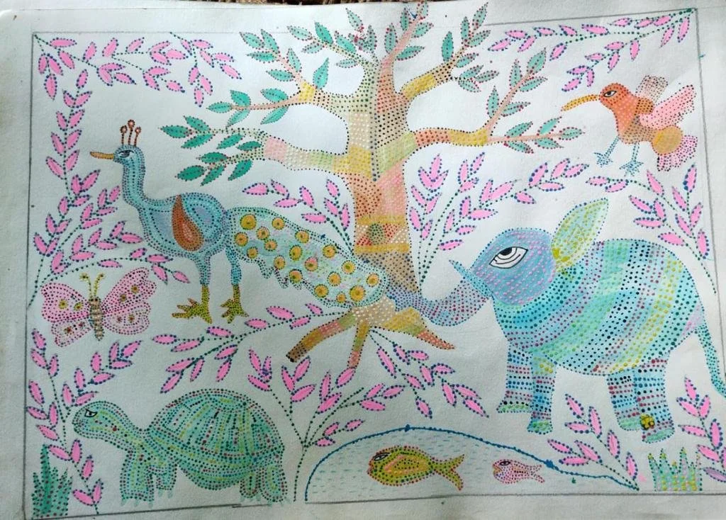 To illustrate the techniques and inspire the children, I created my own Bhil, Warli, and Madhubani paintings on various themes, such as turtle conservation, lake ecosystem restoration, and the importance of early antenatal care registration. What struck me was how quickly the girls picked up the technique, which involves creating intricate patterns with colorful dots. Bhil tribal art is deeply rooted in nature, and I encouraged the girls to explore themes related to the environment and religion.